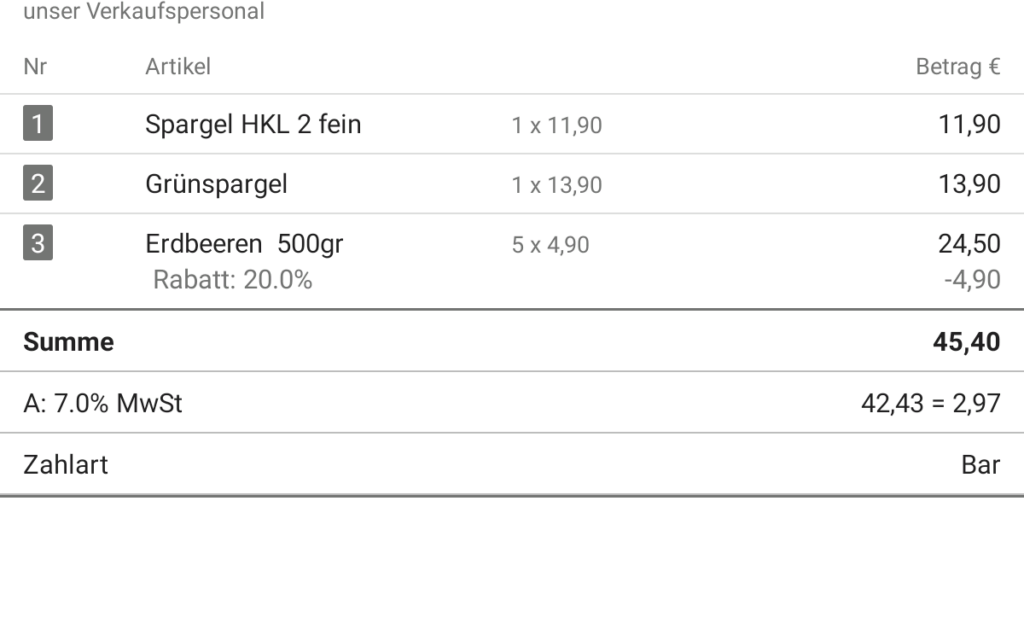 Falls einmal ein Gastro-Betrieb direkt vom Stand kaufen möchte, müssen Sie vor Ort die Berechtigung prüfen. Bei Kassandro gibt es die Rabattfunktion. Hier können die 20% eingegeben werden.